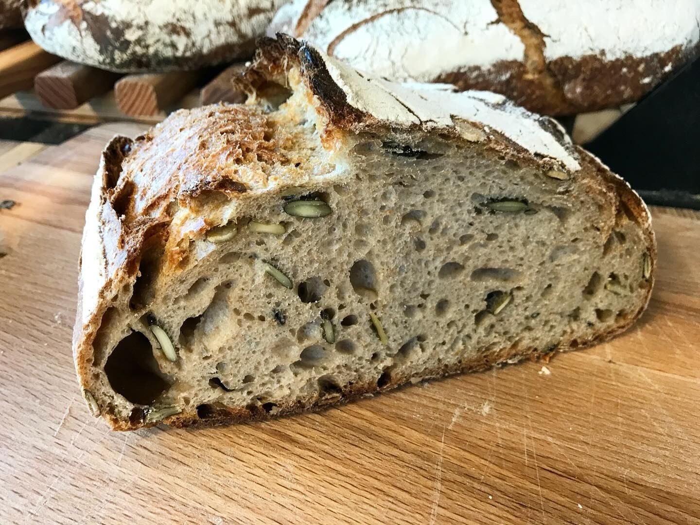 Pain de Campagne aux Graines de Courge (1kg) – Farine de blé semi-complète T80, graines de courge croquantes et levain de seigle, un régal pour les papilles.